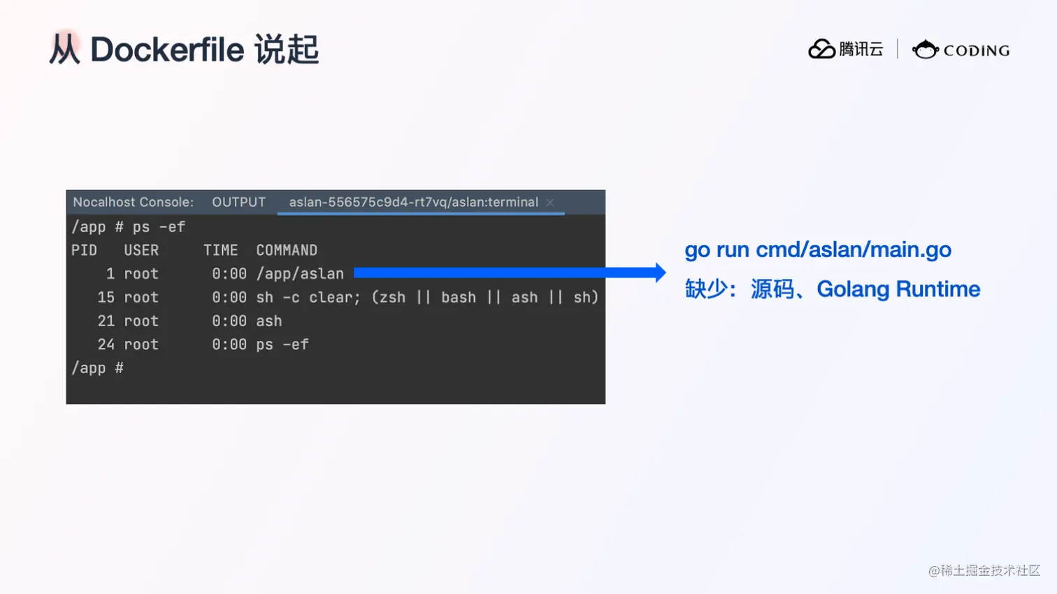 接下来我们继续探讨这种方式的实现原理和方案。首先从 Dockerfile 说起。Dockerfile 里定义了容器的启动命令,一般来说,这是业务进程的启动方式。例如运行一个可执行文件,如果我们进入容器内执行 PS 命令,会发现这个进程对应在容器里面,也就是 PID=1 的进程。我们以 Go 应用为例,如果让这个 PID=1 的进程替换为以源码的方式运行,go run main.go 这种方式,我们是不是就可以实现应用热加载,并且修改代码后只需要重新运行这条命令,就可以看到代码效果呢?