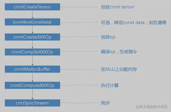 Wrapper 中通过调用 kernel 实现算子功能。示例中调用的是 cnml_add_internal。算子的具体实现主要通过调用 CNML 库的接口来完成,下面是 CNML 库的逻辑: