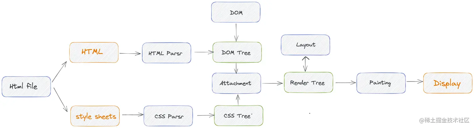 - DOM树构建:HTML解析器将HTML解析成DOM Tree。
