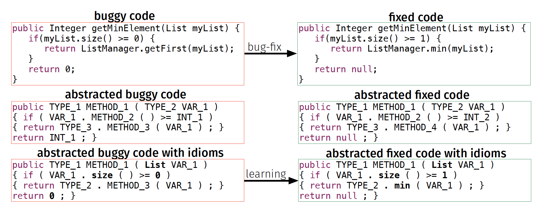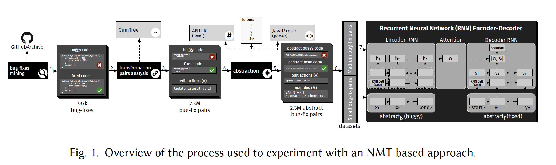 这个问题说难非常难,说简单也很简单。我们把有bug的代码片断和修复之后的代码片断做成数据集,使用类似机器翻译的技术进行训练。然后我们用训练好的模型去预测新代码如何修复。 这个思想和数据集都来自论文《An Empirical Study on Learning Bug-Fixing Patches in the Wild via Neural Machine Translation》