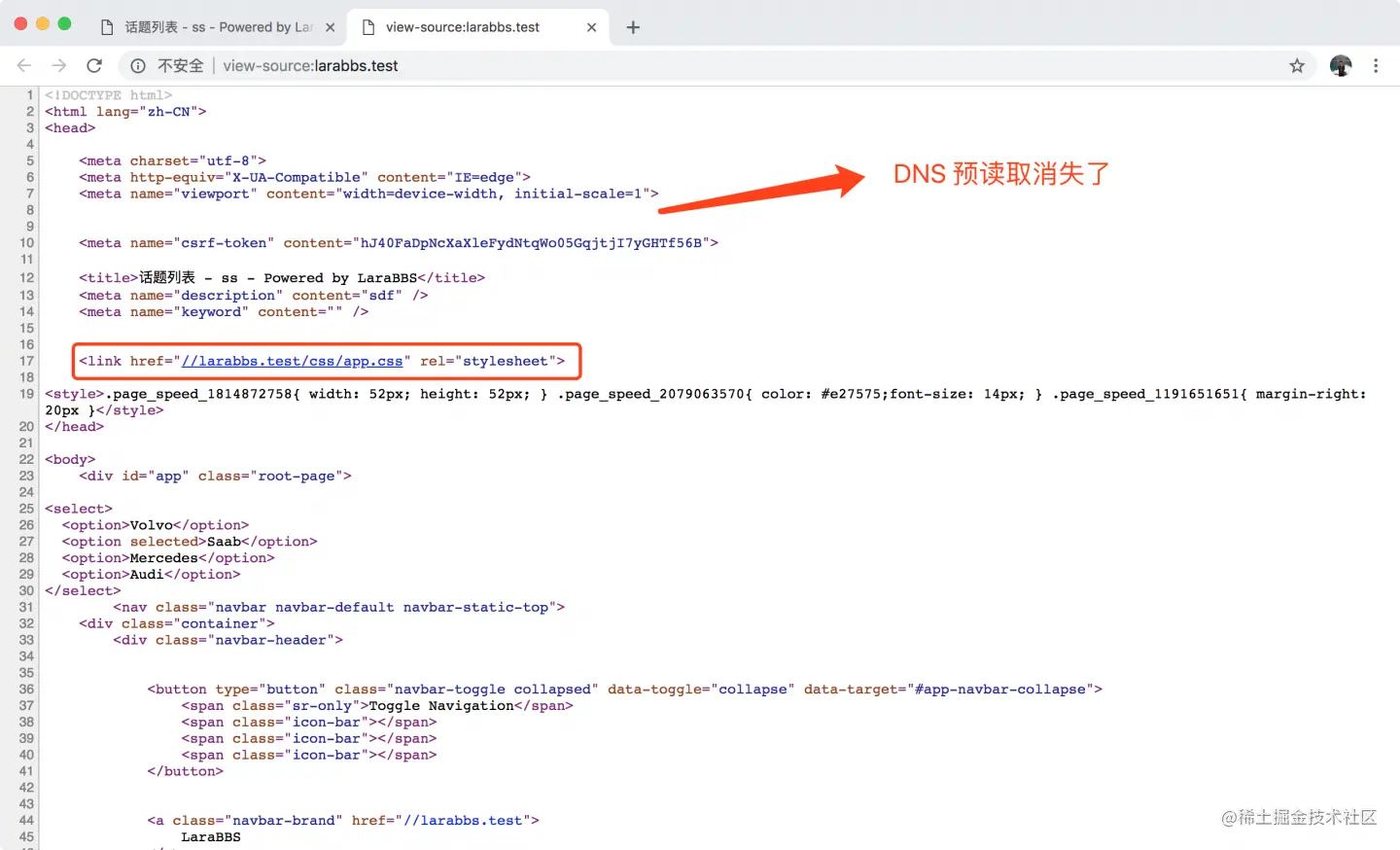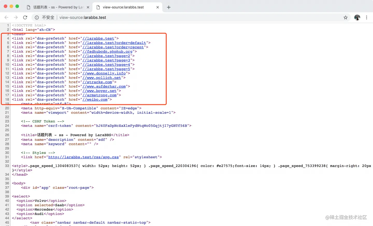 但是这时候你会发现上面 DNS 预读取的标签都消失了,我们解决一下这个 BUG,修改一下中间件的顺序,将 TrimUrls 放在 InsertDNSPrefetch 之前。