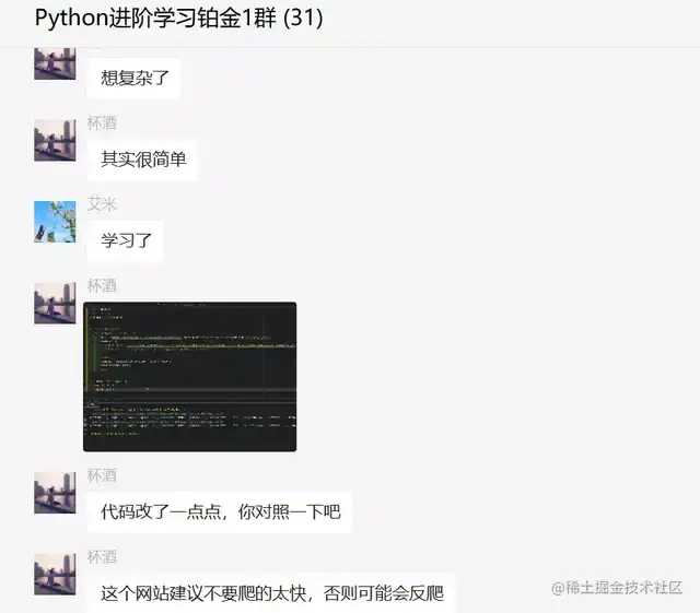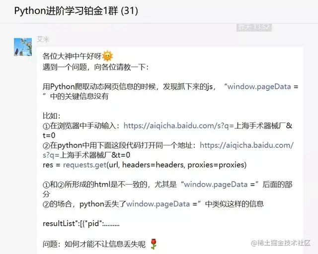 前几天铂金群有个叫【艾米】的粉丝在问了一道关于Python网络爬虫的问题,如下图所示。