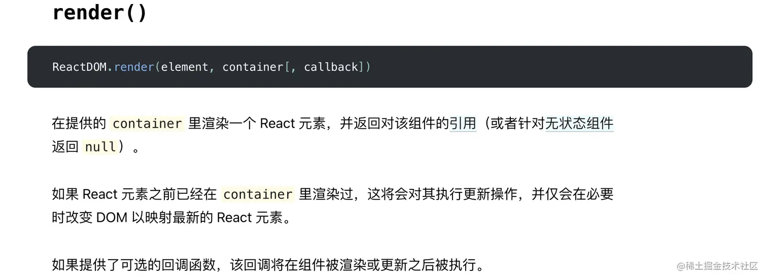 文档上 说在提供的container中渲染一个React元素,返回对该组件的一个引用,如果之前已经渲染过React元素,那么会对其进行更新操作。