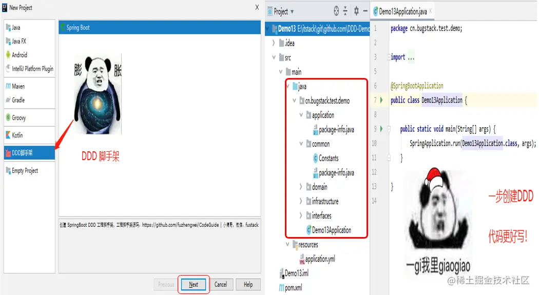 - 快拿去试试吧,启动插件,点击创建工程,傻瓜式点击,就可以创建出一个 DDD 工程结构了。