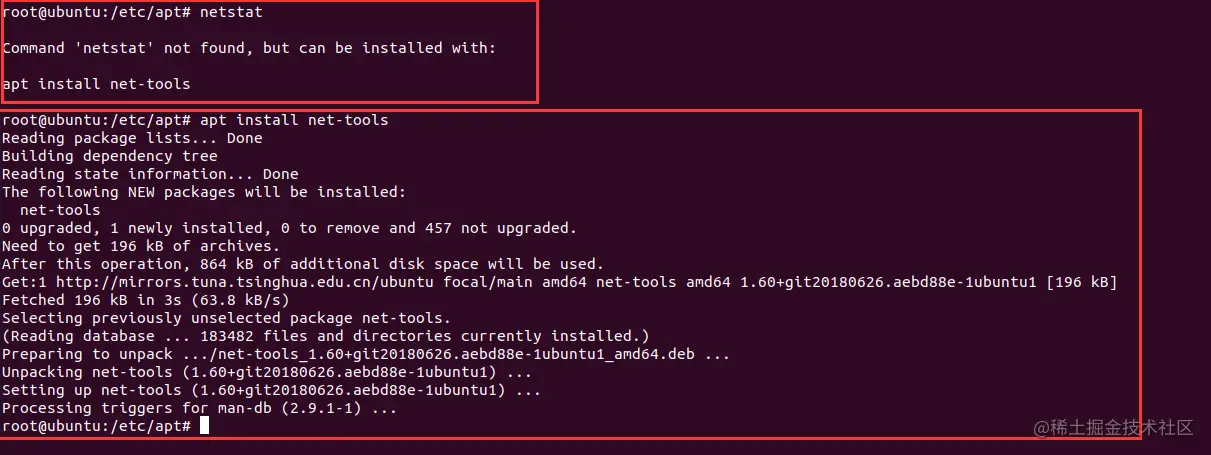 使用 SSH 服务,需要安装相应的服务器和客户端。和 CentOS 不同,Ubuntu 默认没有安装 SSHD 服务 (使用 netstat 指令查看提示没有安装,则执行 : apt install net-tools 安装)。
