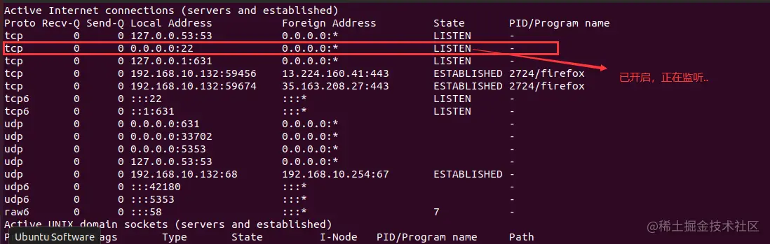 sudo apt-get install openssh-server: 在当前 Linux 上安装 SSH 服务端和客户端(不仅仅是服务端)!service sshd restart: 启动sshd服务,监听 22 号端口!netstat -anp | more: 查看sshd服务!