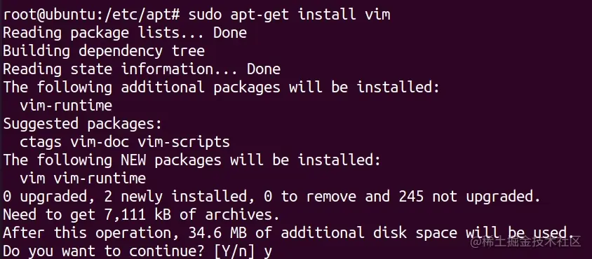 执行 sudo apt-get install vim 下载 vim 编辑器 :