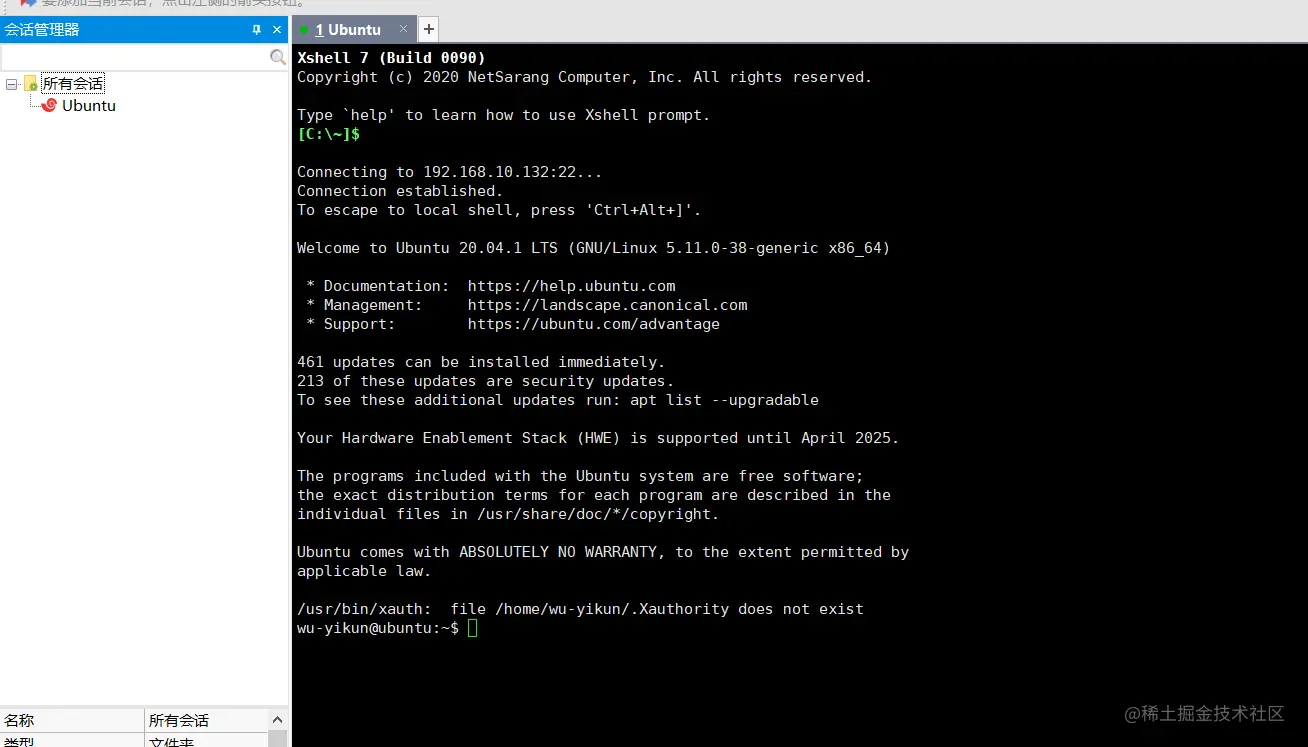 Windows 系统上还可以运行 XShell 对 UbuntuA 进行远程连接,UbuntuB 也可以使用