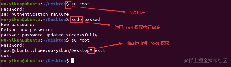 sudo passwd设置 root 用户的密码(用于首次登录 Ubuntu 尚未设置密码时,必须执行!) sudo root: 输入密码后由普通用户切换到 root 用户exit: 退出 root 用户