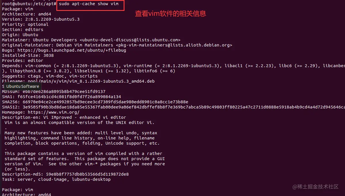 sudo apt-get updatesudo apt-get install vimsudo apt-cache show vimsudo apt-get remove vim