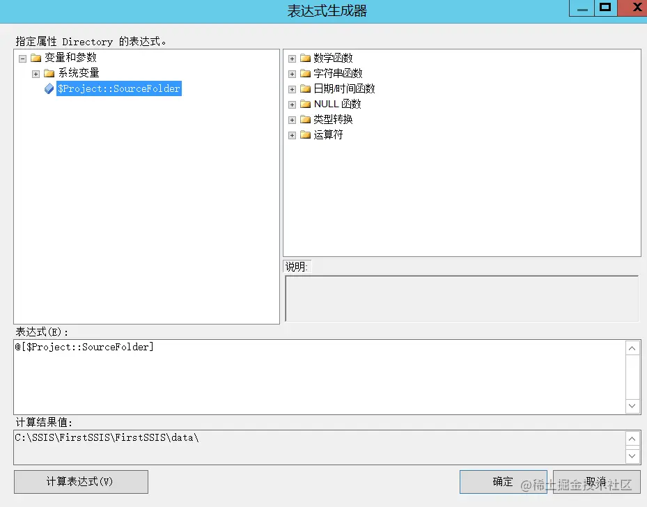 在 “表达式构建器” 窗口左上方的列表框中,展开 “变量和参数” 虚拟文件夹。单击 $Project::SourceFolder 项目参数(project parameter),并将其拖到“表达式”文本框中。单击"Evaluate Expression"按钮,以检查 $Project::SourceFolder 参数的值,如图所示。