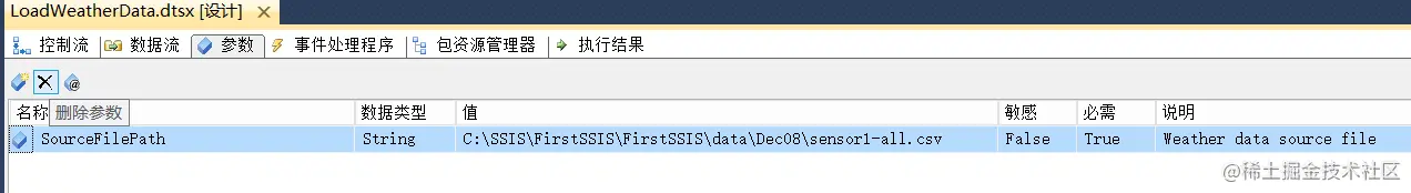 回想上一节 SSIS学习使用十五:SSIS参数概述,我们有一个名为 $Package::SourceFilePath 的包参数,并且该参数值用于设置 “FFCM Temperature and Humidity”平面文件连接管理器 的 ConnectionString 属性。