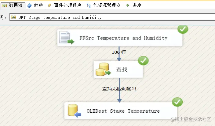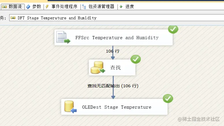 请注意,原始的106行已通过 “FFSrc Temperature and Humidity”平面文件源适配器 从文件加载到数据流中,并且相匹配的行位于 WeatherData.dbo.StageTemperature 表中,因此 "Lookup转换" 经过 "查找无匹配输出" 未发送任何行。