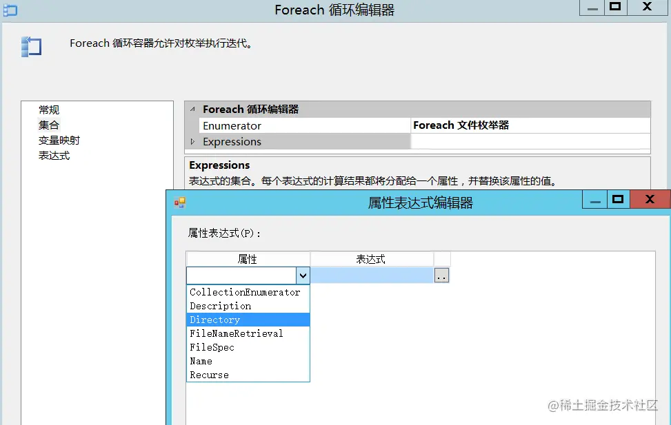 在本例中,需要使 “Foreach文件枚举器” 的文件夹(Directory属性)动态化。在 “属性” 下拉列表中选择 “Directory” 属性,然后在 “表达式”文本框 中单击省略号,以打开“表达式生成器”。