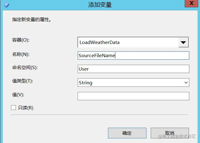 “添加变量”窗口将会显示。将变量名称设置为 SourceFileName。确保将 Container 设置为Package(LoadWeatherData)作用域。默认的命名空间是User,默认的数据类型是String,并且不需要为变量提供默认值,如图所示:
