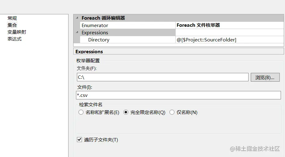 我们需要配置Foreach循环容器,以在data文件夹的子文件夹中搜索 *.csv 文件。