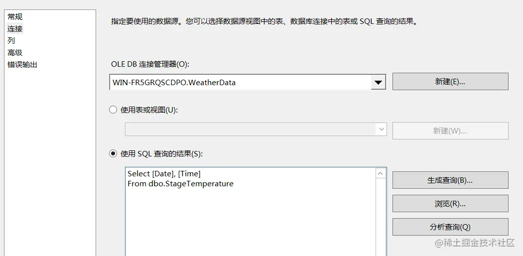 单击 “连接” 页面,并确保在 “OLE DB连接管理器” 下拉列表中选择了 WIN-FR5GRQSCDPO.WeatherData 连接管理器。将下面的语句添加到 “使用SQL查询的结果” 文本框中,如图所示。