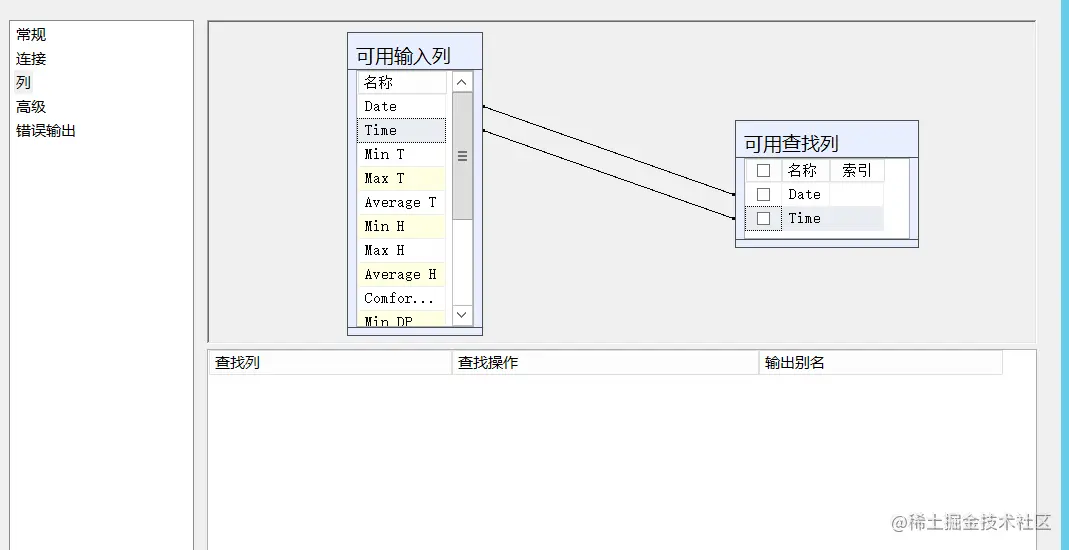 在 Columns 页面(图11)上,我们配置查找比较哪些列用来检查匹配的行。我们将“可用输入列”的Date列映射到“可用查找列”的ate列,并将“可用输入列”的Time列映射到“可用查找列”的Time列。这意味着,包含Date和Time的两列的值必须都相等才能触发匹配。