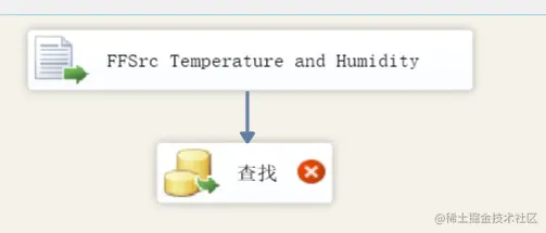 从SSIS工具箱拖拽一个 "查找转换"(Lookup Transformation) 到数据流界面。从 “FFSrc Temperature and Humidity” 平面文件源适配器连接一个 数据流路径(data flow path) 到新的 查找转换,如图所示。