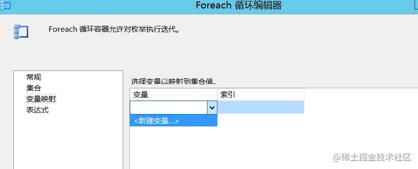 可以在 “变量映射”(Variable Mappings) 页面上创建此 SSIS 变量。单击 Variable 下拉列表,然后单击“<New Variable…>”,如图所示。