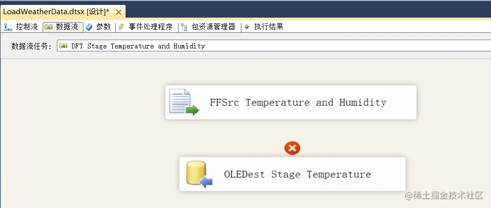 点击从 “FFSrc Temperature and Humidity” 平面文件源适配器连接到 “OLEDest Stage Temperature” OLE DB目标适配器 的数据流路径,然后删除数据流路径,如图所示。
