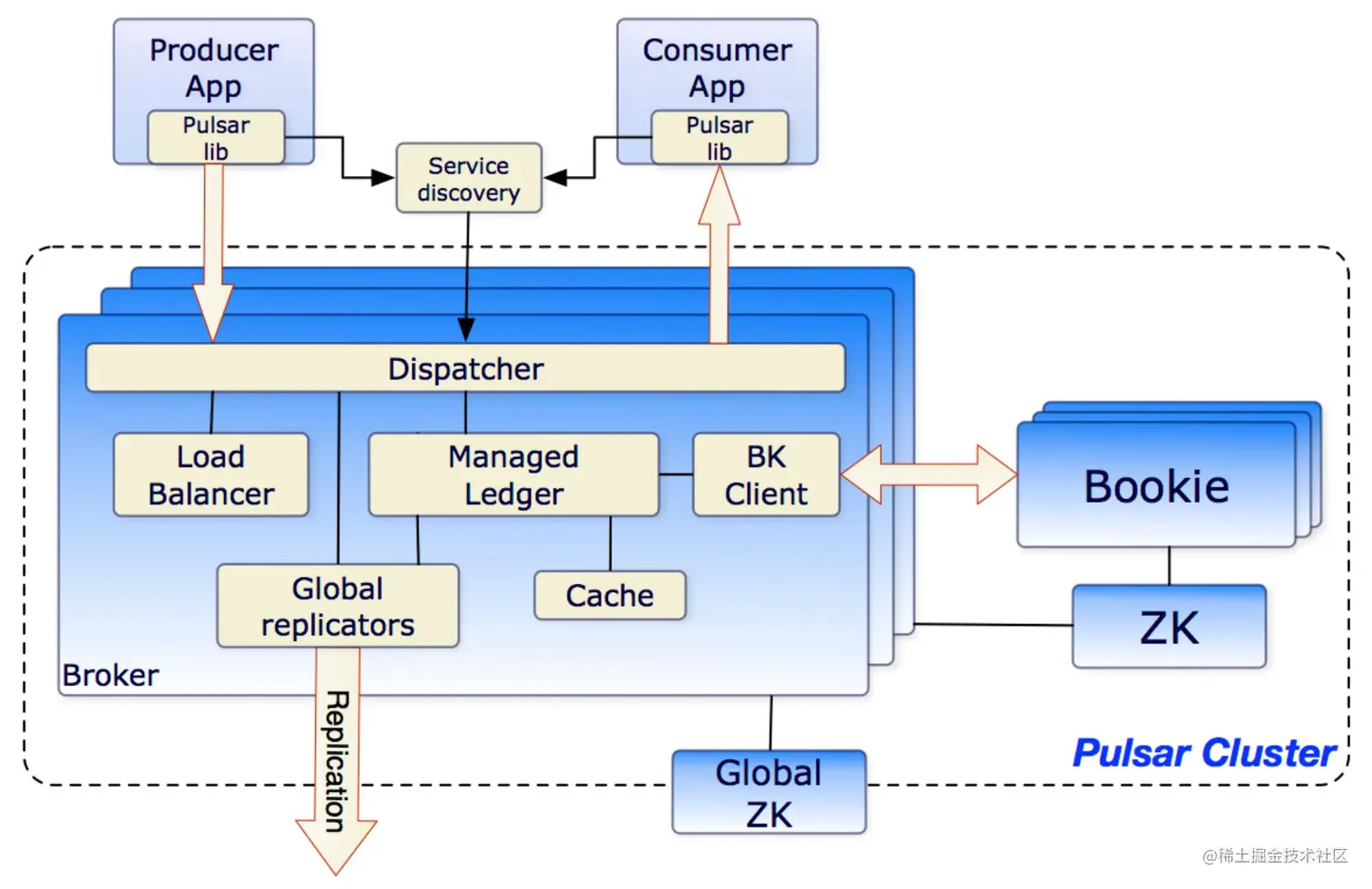 - Pulsar采用存储计算分离的架构,pulsar使用了bookkeeper做消息的存储,bookkeeper保证了消息存储的可靠性和高效性,bookkeeper为pulsar提供了存储的扩展能力。