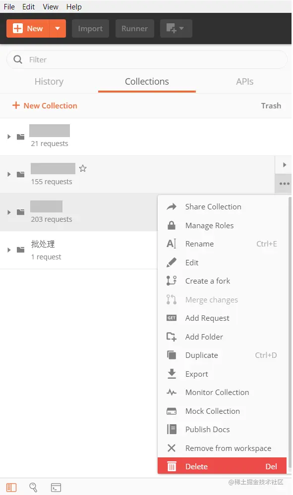 点击collection名右边三个点,点击Delete,把不再需要的collection点击删除: