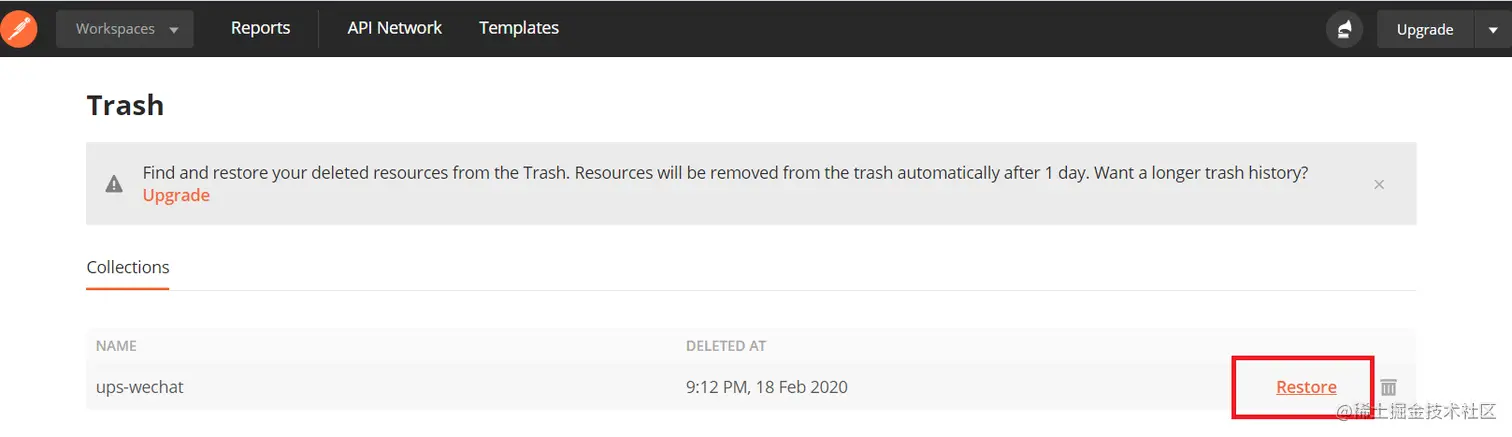 浏览器将打开你的postman官网的trash页面:https://{你的组名}.postman.co/me/trash(你的组名your team’s name将在你登录后可以看到)。鼠标移至误删的collection上,将出现restore和删除图标。点击restore即可将误删的collection恢复啦!不幸的是,免费版本的资源在垃圾箱只保留一天,一天后资源将自动从垃圾箱中移除。 小心操作,否则想要保留更长的垃圾记录,那就只有升级了。