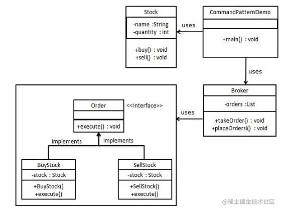 我们首先创建作为命令的接口 Order,然后创建作为请求的 Stock 类。实体命令类 BuyStock 和 SellStock,实现了 Order 接口,将执行实际的命令处理。创建作为调用对象的类 Broker,它接受订单并能下订单。