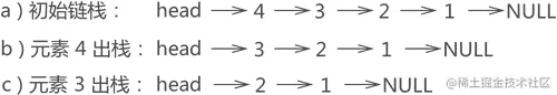 例如,图 2e) 所示的链栈中,若要将元素 3 出栈,根据"先进后出"的原则,要先将元素 4 出栈,也就是从链表中摘除,然后元素 3 才能出栈,整个操作过程如图 3 所示: