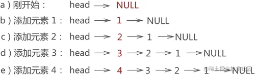 例如,将元素 1、2、3、4 依次入栈,等价于将各元素采用头插法依次添加到链表中,每个数据元素的添加过程如图 2 所示:
