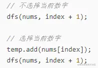 递归的终止条件为 target <= 0 或者 candidates 数组被全部用完。那么在当前的函数中,每次我们可以选择跳过不用第 startIndex 个数,即执行 backtrack(candidates, target, path, startIndex + 1)。也可以选择使用第 startIndex个数,即执行 dfs(candidates, target - candidates[startIndex ], combine, startIndex ).