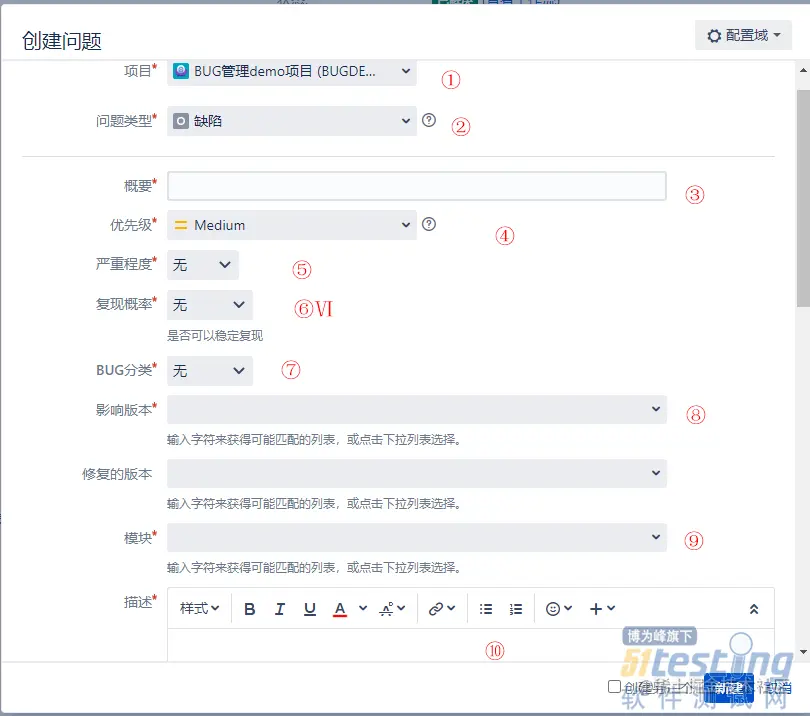 创建bug时,参考下图,可以看见目前统一模板有如下10个必填项: