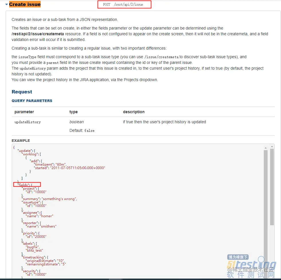 createissue接口定义,baseurl参考公司网址,此接口的详细url为:/rest/api/2/issue,方法为method。