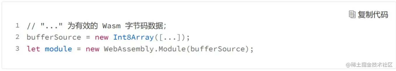 这里的 WebAssembly.Module 构造函数接受一个包含有效 Wasm 二进制字节码的 ArrayBuffer 或者 TypedArray 对象。WebAssembly.Instance 构造函数的用法与 WebAssembly.Module 类似,只不过是构造函数的参数有所区别。