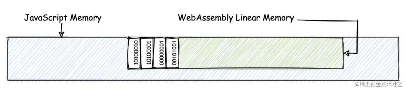 浏览器在为 Wasm 模块对象分配线性内存时,会将这部分内存与 JavaScript 现有的内存区域进行隔离,并单独管理,可以参考下面的这张图。在以往的 JavaScript Memory 中,我们可以存放 JavaScript 中的一些数据类型,这些数据同时也可以被相应的 JavaScript / Web API 直接访问。而当数据不再使用时,它们便会被 JavaScript 引擎的 GC 进行垃圾回收。