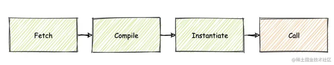 首先是 “Fetch” 阶段。作为一个客户端 Web 应用,在这个阶段中,我们需要将被使用到的 Wasm 二进制模块,从网络上的某个位置通过 HTTP 请求的方式,加载到浏览器中。这个 Wasm 二进制模块的加载过程,同我们日常开发的 Web 应用在浏览器中加载 JavaScript 脚本文件等静态资源的过程,没有任何区别。对于 Wasm 模块,也可以选择将它放置到 CDN 中,或者经由 Service Worker 缓存,以加速资源的下载和后续使用过程。