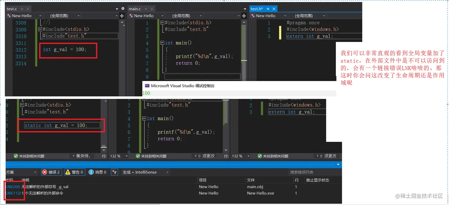 例如extern int g_val;绝对不可以写成extern int g_val = 100;
