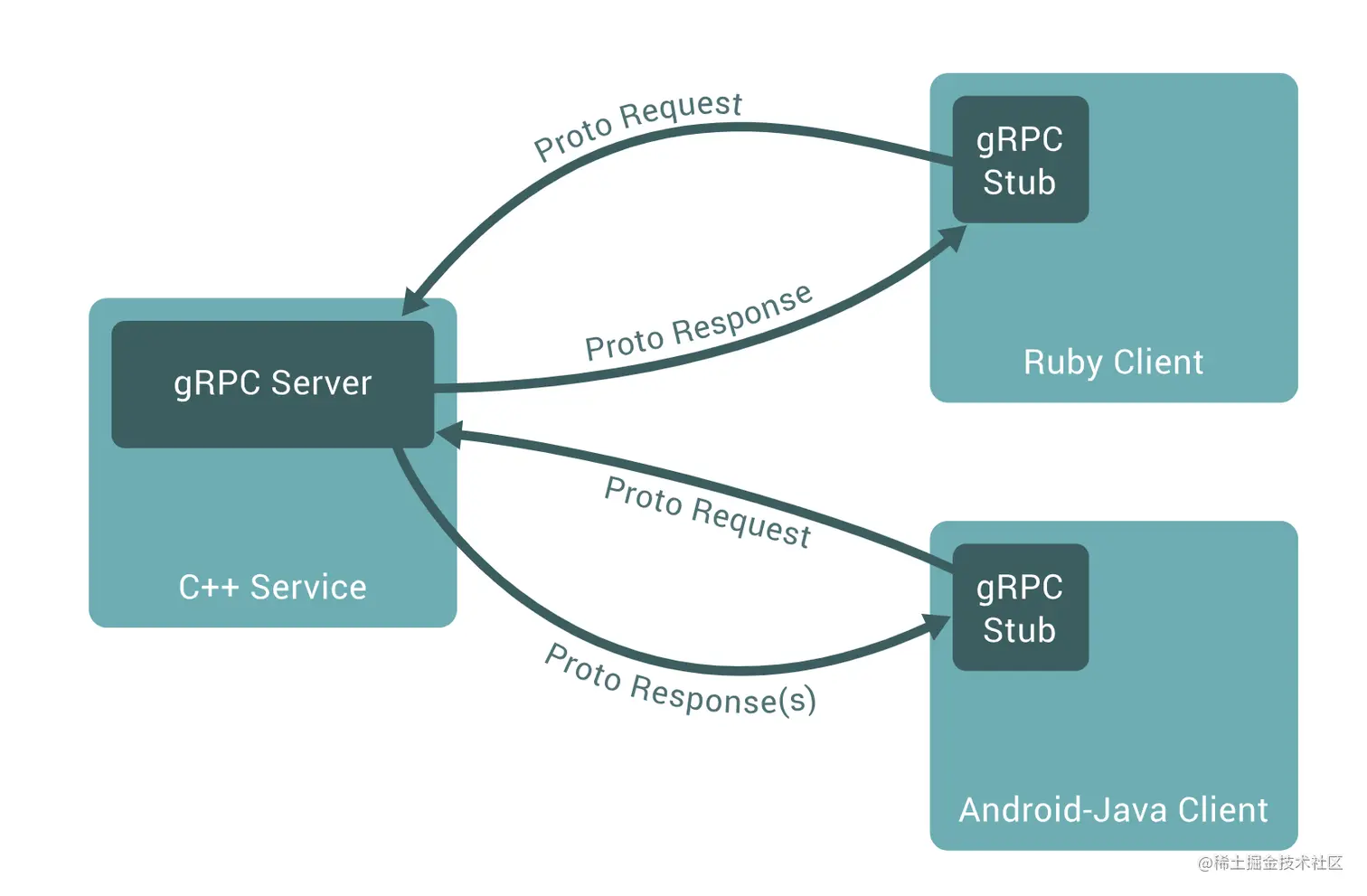 - 在客户侧,客户端有一个存根实现了服务端同样的方法。客户端可以在本地存根调用这些方法,用合适的 protocol buffer 消息类型封装这些参数— gRPC 来负责发送请求给服务端并返回服务端 protocol buffer 响应。