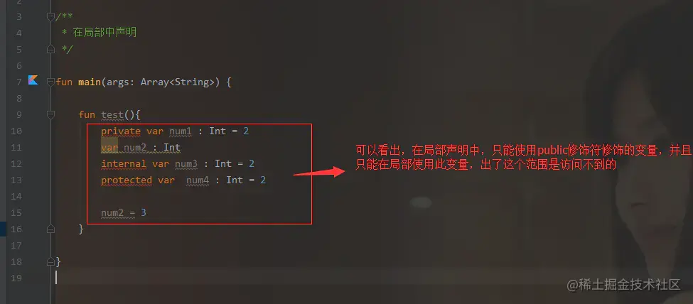 public修饰符修饰的变量。并且在变量只能在局部这个范围内使用,出了这个范围后就访问不到了。\