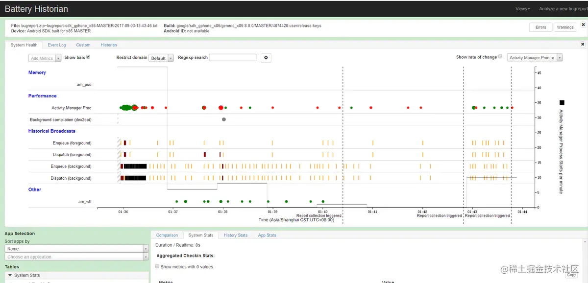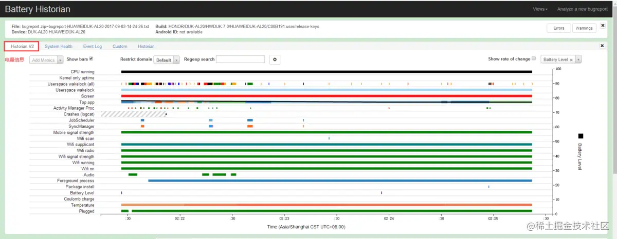 Battery Historian 是一个这样的的工具:可以在 Android 5.0 Lollipop(API 级别21)及更高版本的 Android 设备上检测与电池相关的信息和事件,而在此期间,该设备没有插上电源。它允许应用程序开发人员在时间轴上可视化系统和应用级别的事件,并使用平移和缩放功能,在设备最后一次完全充电之后,可以轻松地查看各种聚合统计信息,可以选择一个应用程序,检查所选择的应用程序对电池指标的影响。此外,它还允许对两个错误报告进行 A/B 比较,突出显示了关键电池相关指标的差异。