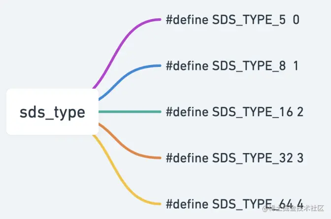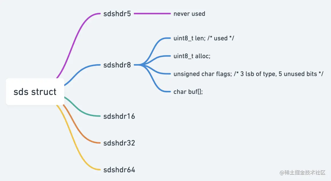 SDS 结构中有一个元数据 flags,表示的是 SDS 类型(最低 3 位)。事实上,SDS 一共设计了 5 种类型,分别是 sdshdr5、sdshdr8、sdshdr16、sdshdr32 和 sdshdr64。这 5 种类型的主要区别就在于,它们数据结构中的字符数组现有长度 len 和分配空间长度 alloc,这两个元数据的数据类型不同。