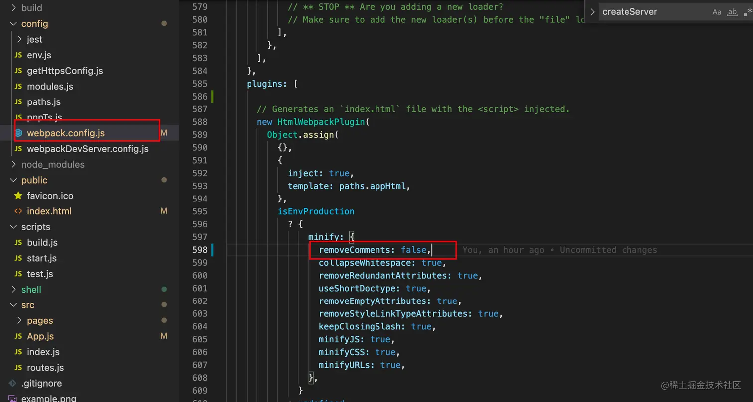 新的react脚手架将webpack.config.js和webpack.dev.config.js合并,在判断处添加即可,如下所示