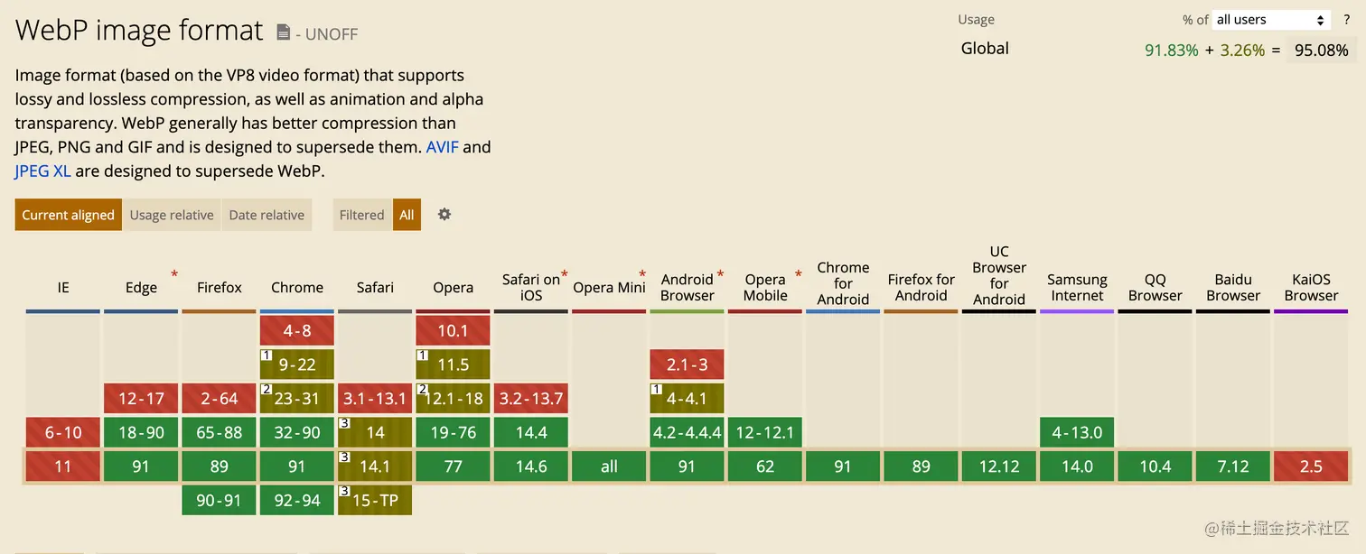 下图可以看出,相对于传统的图片格式,WebP 格式存在浏览器兼容性方面的问题。本文通过工程化的手段来实现 WebP 格式的自适应加载。