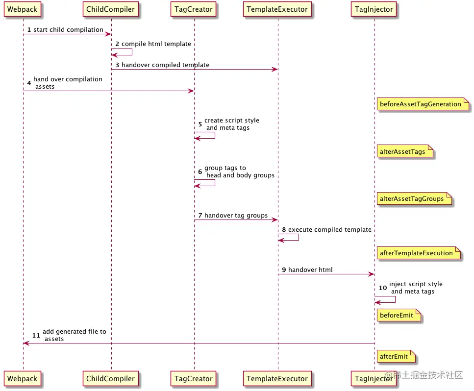 前端项目通常会用到 html-webpack-plugin,该插件可以协助创建 HTML 文件并自动引入 Webpack 生成的 bundle,插件中提供有多个 hook,如下图所示。为确保已经生成了 head 和 body 标签,可以选择 在 alterAssetTagGroup 阶段注入相关的判断代码。