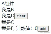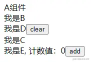 要实现的效果为,E组件中点击add,会增加计数值。点击D组件的clear按钮,会对E组件的计数值进行清零。