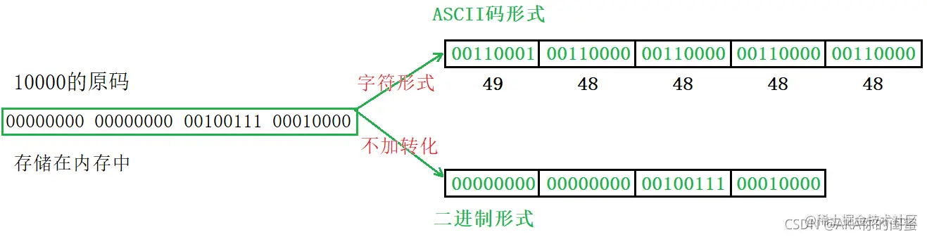 例有整数10000,若以ASCII码的形式存储,则5个字符共需5个字节。若以二进制的形式存储,则转化成补码,整型数据共需4个字节。