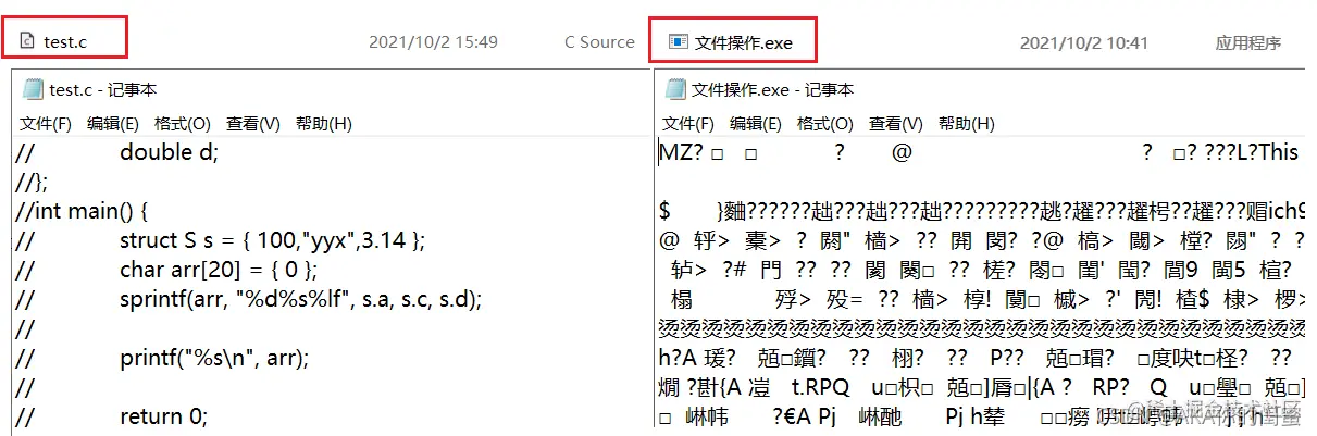 test.c打开后可以看懂,则是文本文件,*.exe打开后显示乱码,则是二进制文件。