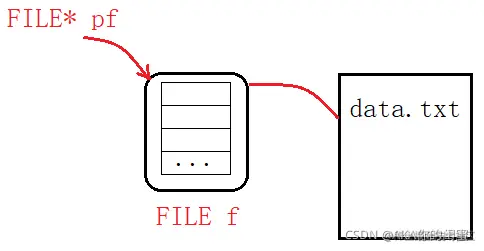 通过FILE类型的结构体指针变量pf,可指向某个文件信息区从而操作该文件。如图: