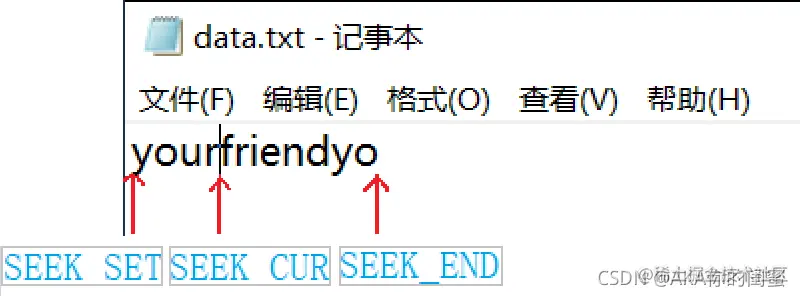 'f'相对于起始位置SEEK_SET的偏移量为4,相对于文件末尾SEEK_END的偏移量为-8。